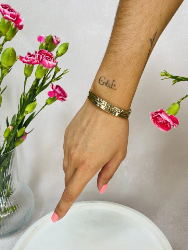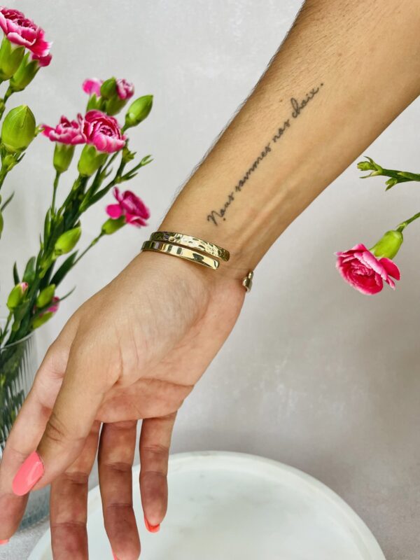 La personnalisation des bracelets est possible pour la plupart des pièces de Clairette Collection (essentiellement à l’intérieur des joncs) car certains offrent une surface suffisante permettant la gravure à la main. Il est, dans ce cas, possible d’y faire graver ce que tu souhaites, y compris de longues phrases.